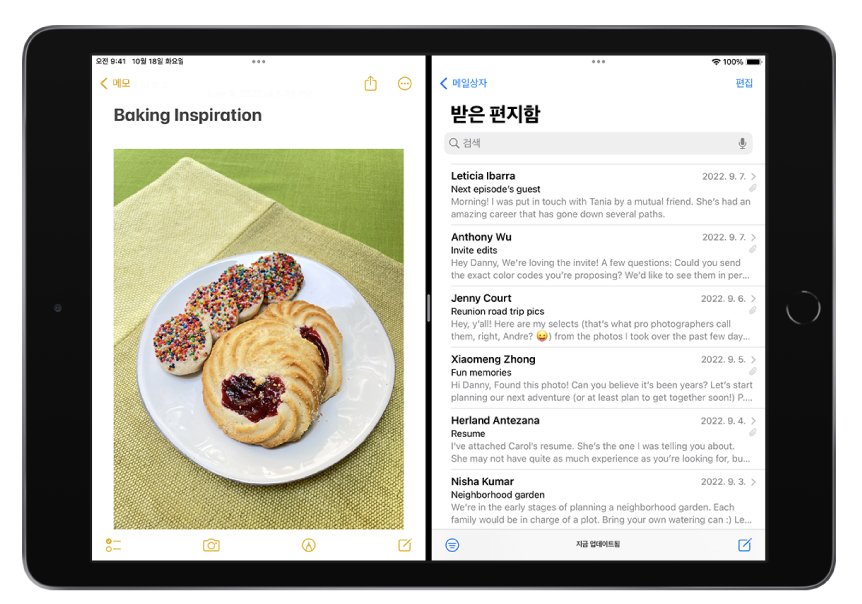 분할 보기 사용: 분할 보기는 iPad에서 두 개의 앱을 나란히 사용할 수 있는 기능입니다. 이 기능은 다른 앱에서 작업하면서 한 앱의 정보를 참조해야 할 때 유용합니다. 분할 보기를 사용하려면 화면 하단에서 위로 스와이프하여 도크에 액세스한 다음 앱 아이콘을 길게 터치하여 분할 보기 모드로 전환하면 됩니다.