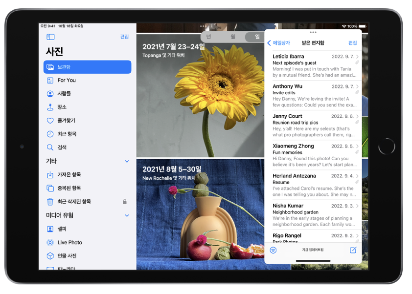 분할 보기 사용: 분할 보기는 iPad에서 두 개의 앱을 나란히 사용할 수 있는 기능입니다. 이 기능은 다른 앱에서 작업하면서 한 앱의 정보를 참조해야 할 때 유용합니다. 분할 보기를 사용하려면 화면 하단에서 위로 스와이프하여 도크에 액세스한 다음 앱 아이콘을 길게 터치하여 분할 보기 모드로 전환하면 됩니다.