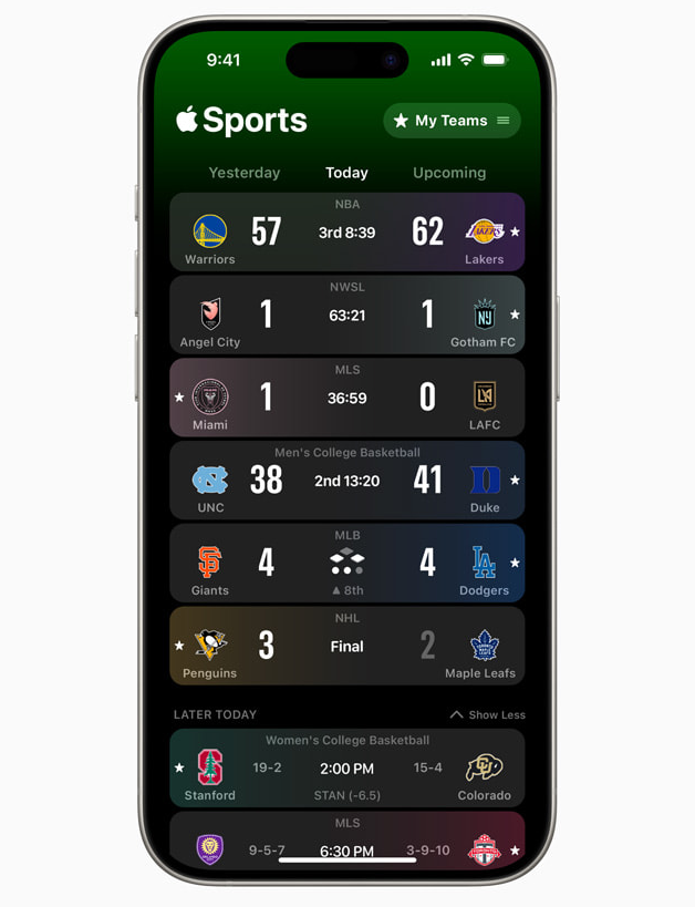 사용자는 Apple Sports에서 좋아하는 팀, 토너먼트, 리그를 팔로우함으로써 자신만의 스코어보드를 맞춤 설정할 수 있습니다. 팬들은 스코어와 다가오는 경기 사이를 쉽게 넘나들며, 플레이별 정보, 팀 통계, 라인업 세부 사항, 실시간 배팅 확률 등을 탐색할 수 있습니다.