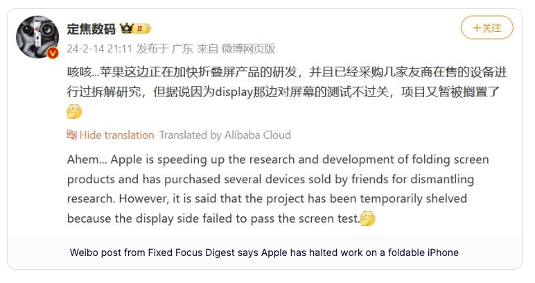 미국의 정보기술(IT) 매체 폰아레나는 중국 IT 정보유출자 '픽스드 포커스 디지털'을 인용해, 애플이 자체 실험을 통해 폴더블폰 화면의 내구성이 자사의 엄격한 기준을 충족하지 못함을 발견하고, 이에 따라 폴더블 아이폰 개발을 잠정적으로 보류하기로 결정했다고 보도했습니다.