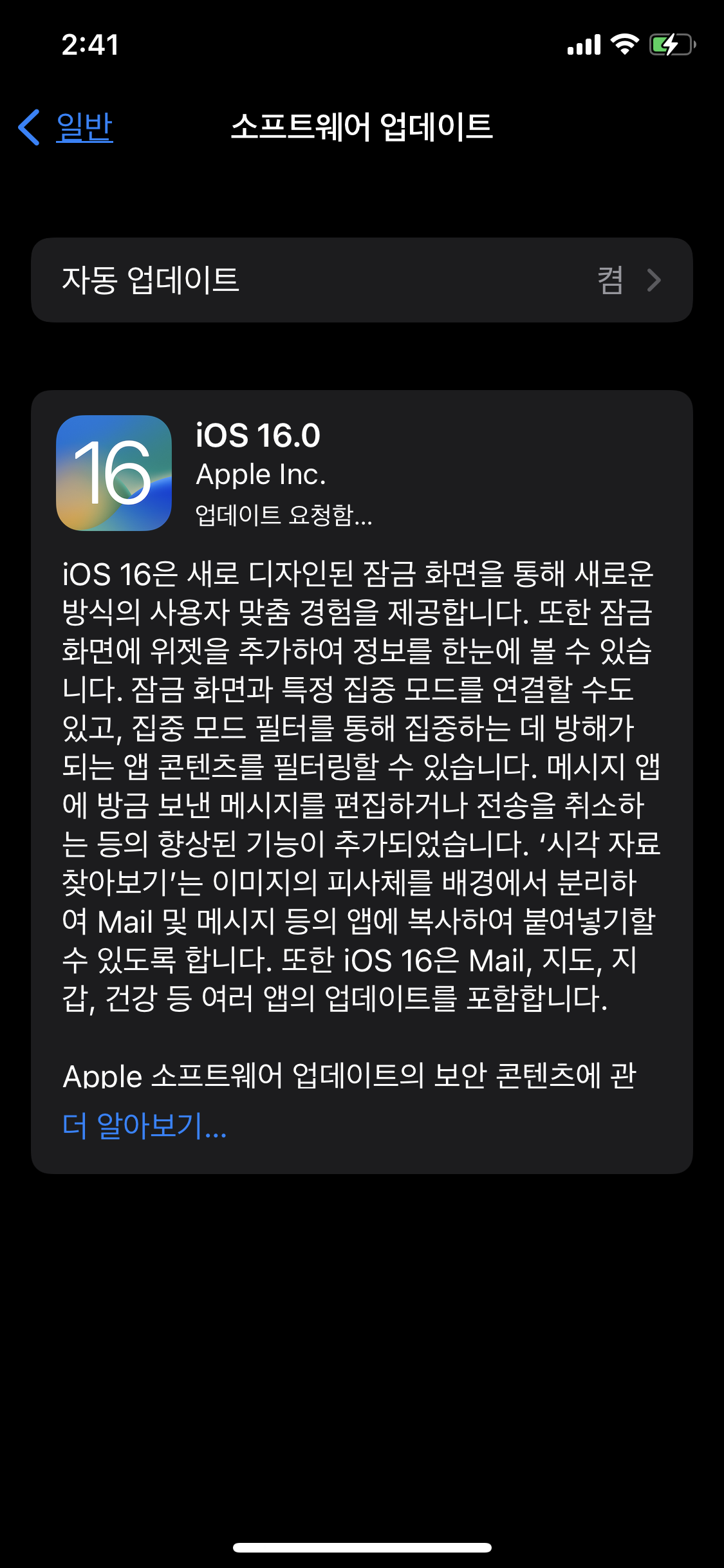 이제 iOS가 16이라 최신 버전이라고 나옵니다. 정상적으로 설치가 된 것이죠.