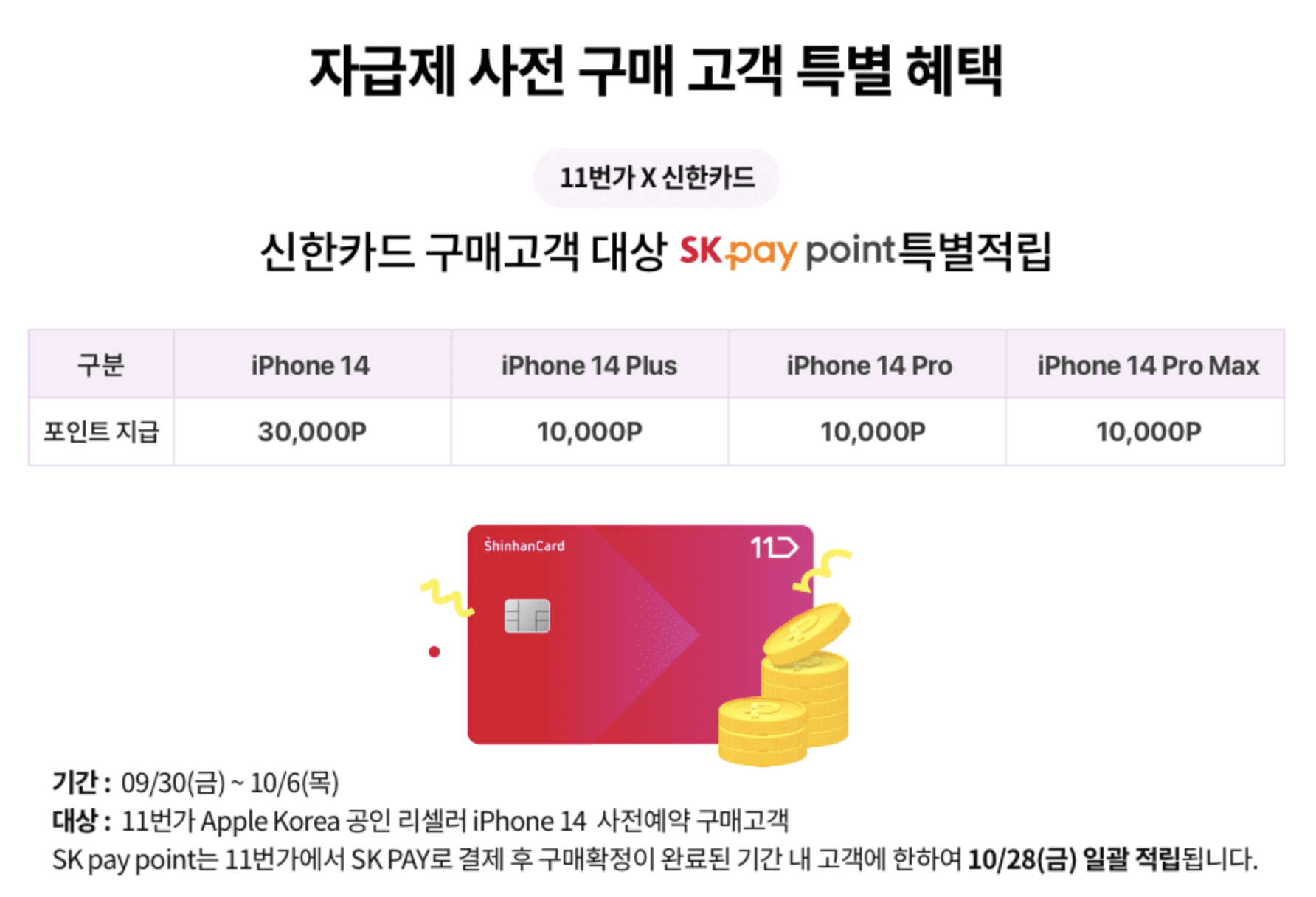 아이폰14프로 8% 할인 쿠폰, 아이폰14, 플러스 10% 할인 쿠폰을 발급하고 있으며 카드 무이자는 최대 22개월, T멤버십은 3천원 추가 할인이 있습니다. 신한카드 대상으로 SK pay 포인트 최대 3만 포인트까지 특별 적립됩니다.
