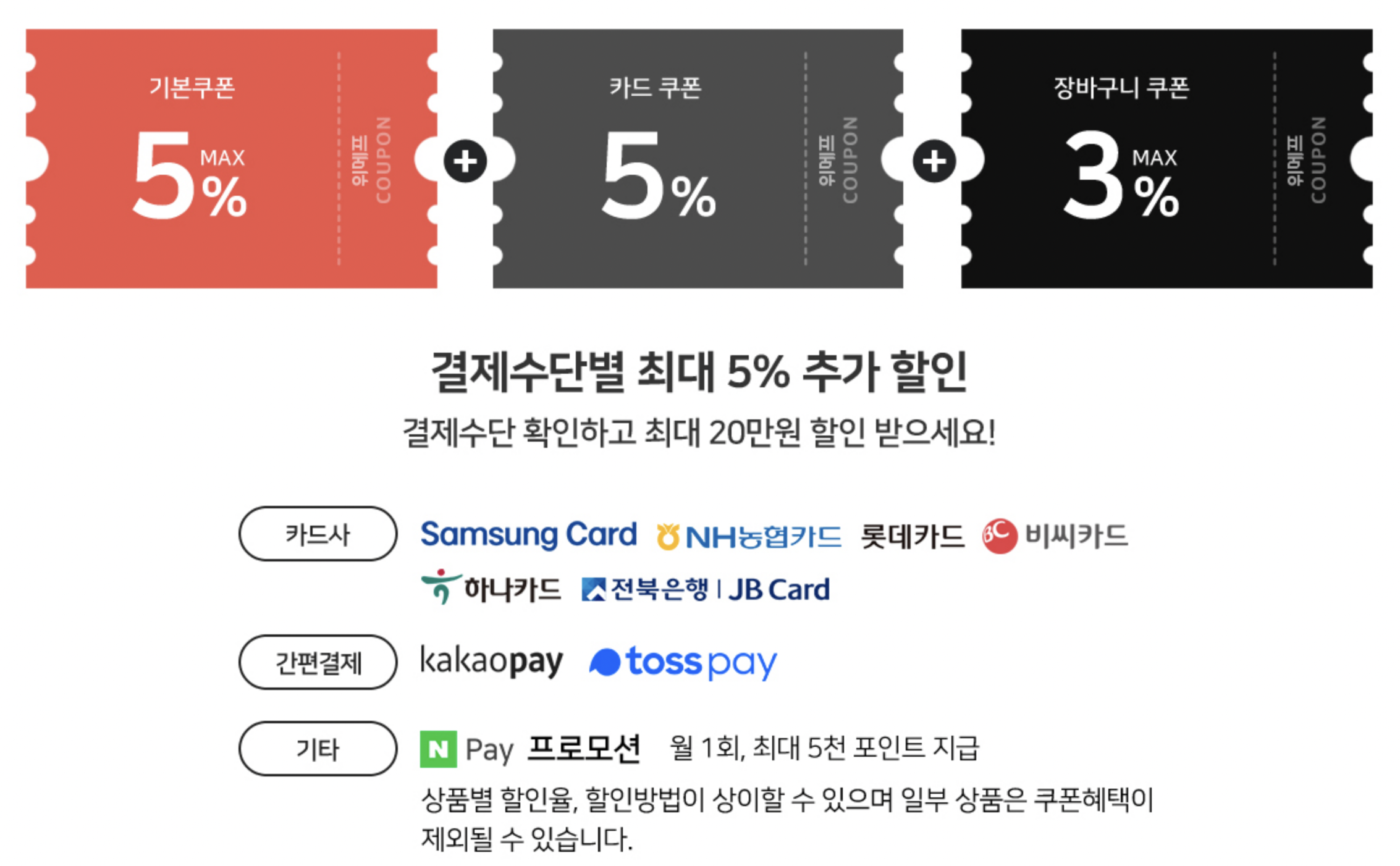 삼성카드, NH농협카드, 롯데카드, 비씨카드, 하나카드, 전북은행 JB 카드 기본 쿠폰 5%, 카드 쿠폰 5%, 장바구니 쿠폰 3%까지 가능합니다. 네이버 페이도 최대 5천 포인트 지급 받을 수 있네요.
