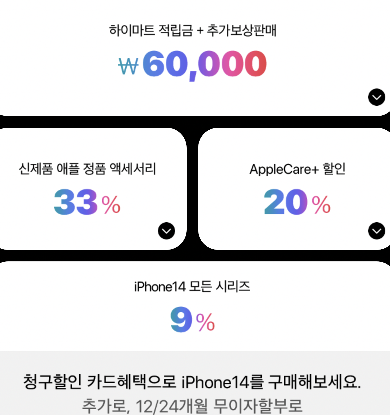 하이마트는 적립금, 추가보상판매 6만원에 신제품 애플 정품 액세서리 33%, 애플케어플러스 20% 할인도 있습니다. 모든 아이폰14 시리즈가 9% 할인이 된다면 아이폰14프로를 구매하는 분들께 가장 유리할 것 같습니다. 추가 12/24개월 무이자 할부도 제공됩니다.