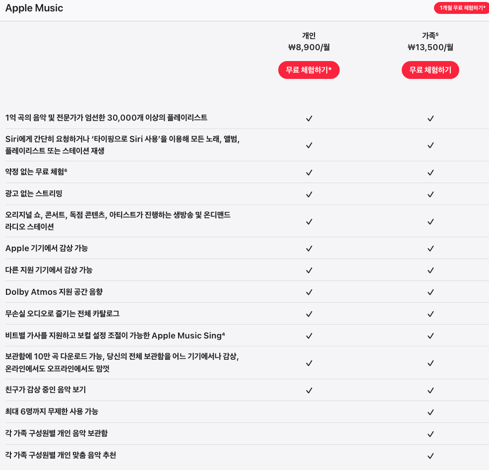 애플뮤직에는 다양한 구독 옵션이 있습니다. 개인 멤버십은 무료 체험을 통해 시작하고, 이후 월 8,900원에 이용할 수 있습니다. 가족 구성원과 공유하는 Apple Music 가족 멤버십은 월 13,500원에 이용할 수 있으며, 최대 5명의 가족 구성원이 개별 계정을 사용할 수 있습니다. 또한 Apple One을 이용하면 Apple Music을 포함한 3개의 다른 Apple 서비스를 하나의 월간 멤버십으로 이용할 수 있습니다. Apple One의 요금은 월 14,900원부터 시작합니다.