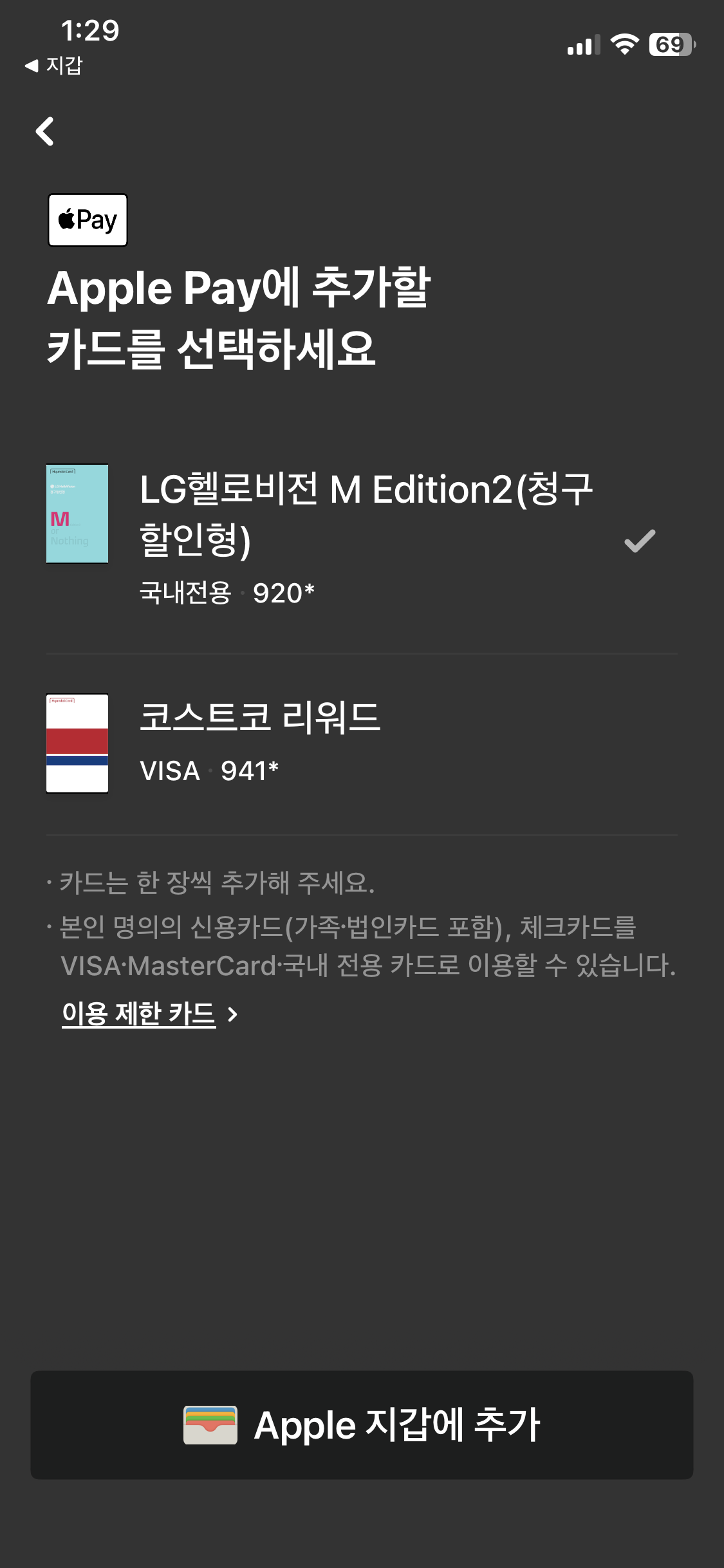 저는 아이폰과 애플워치에 애플페이를 추가할 수 있다고 나왔습니다. 카드 한 장씩 한 기기씩 따로 등록해줘야 하는 것 같네요.