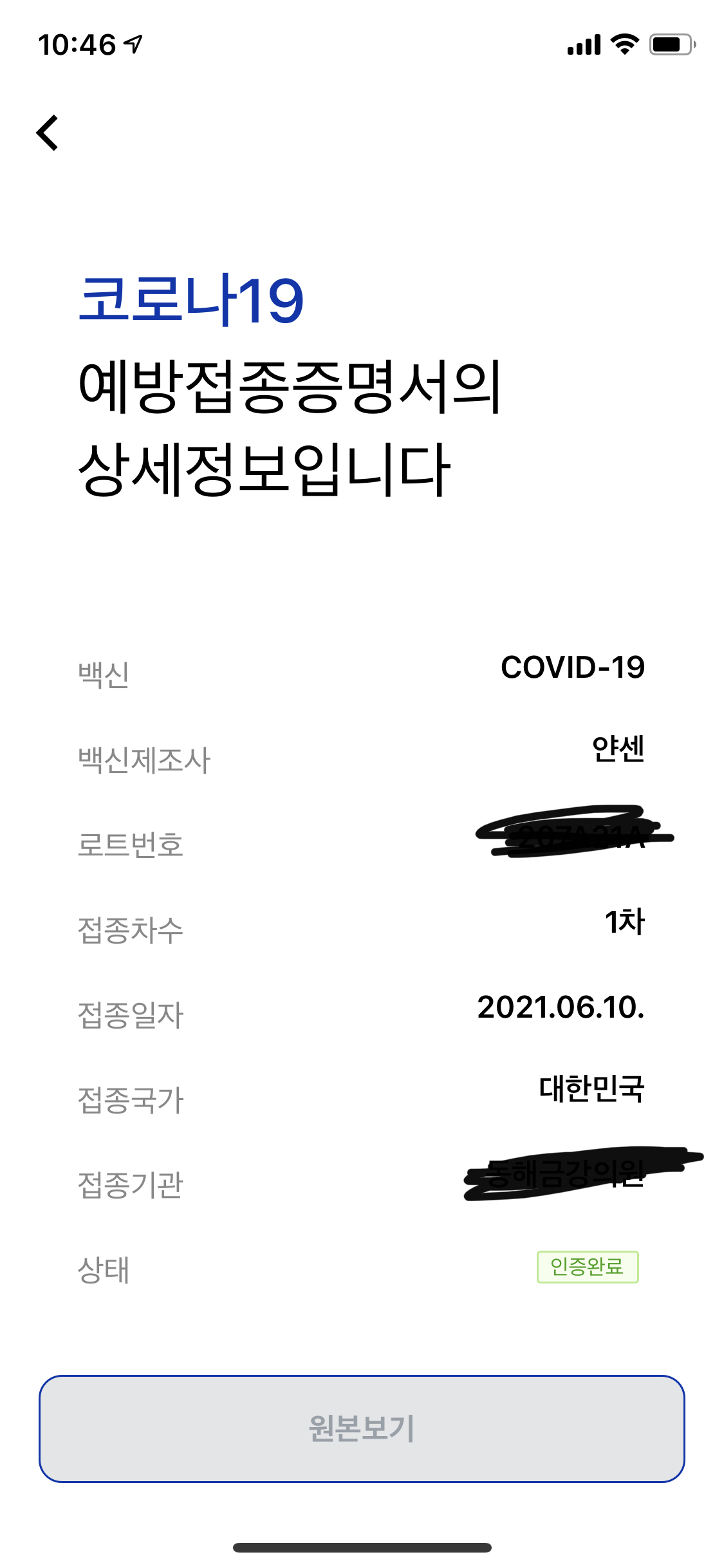 아래는 질병관리청 COOV(쿠브) 앱에서 발급받은 코로나19 예방접종 증명서입니다.