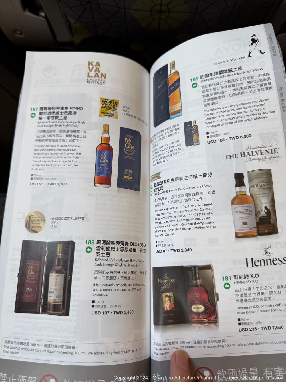 카발란 비노바리끄 700미리는 95달러, 대만 달러로는 3100으로 약 13만원정도의 가격에 판매되고 있었습니다. 기내면세점이라 꽤 저렴하죠.