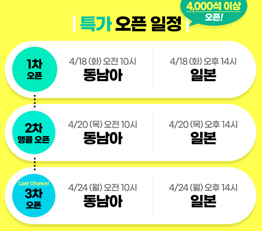 특가 오픈은 총 3차에 걸쳐 진행되며, 일본 노선의 경우 편도 총액 기준으로 항공운임이 0원입니다. 동남아 노선의 경우에도 편도 총액 기준으로 항공운임이 무료입니다.