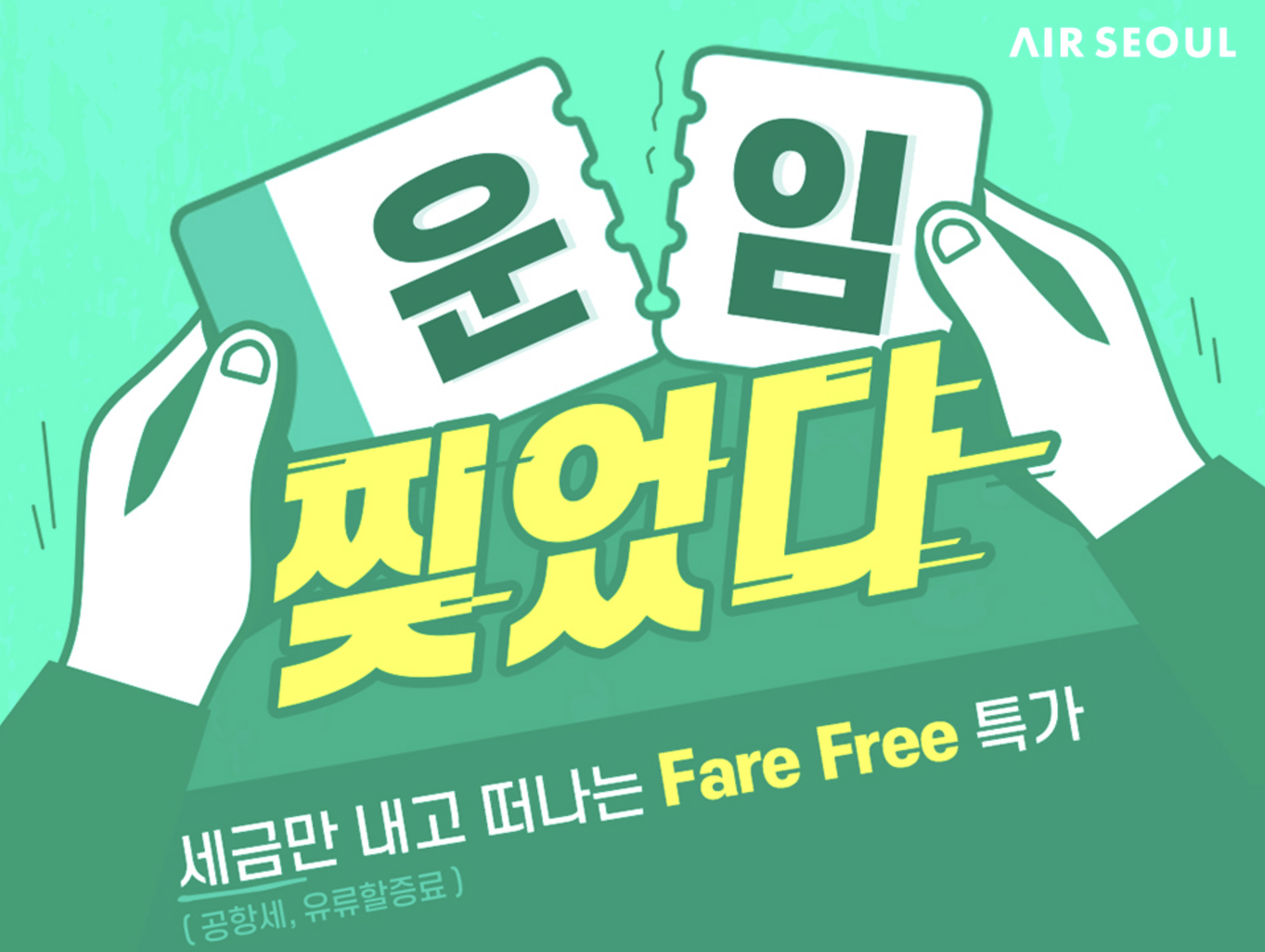 에어서울은 내일(18일) 오전 10시부터 국제선 Fare Free(운임 무료) 특가 프로모션을 진행한다고 오늘(17일) 밝혔다. 항공운임이 0원으로, 유류할증료와 공항시설이용료만 결제하면 된다. 탑승 기간