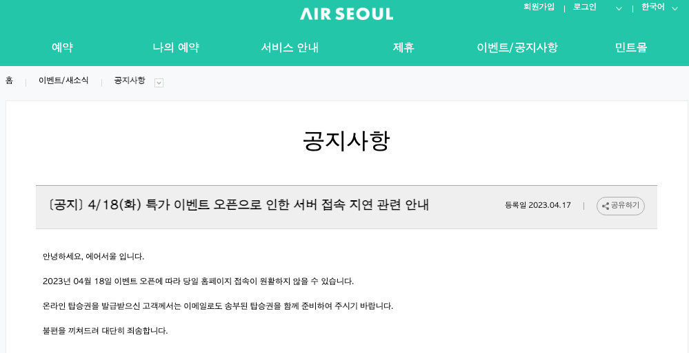 에어서울 서버 접속 지연은 현실이 되었습니다. 무한 대기의 굴레...