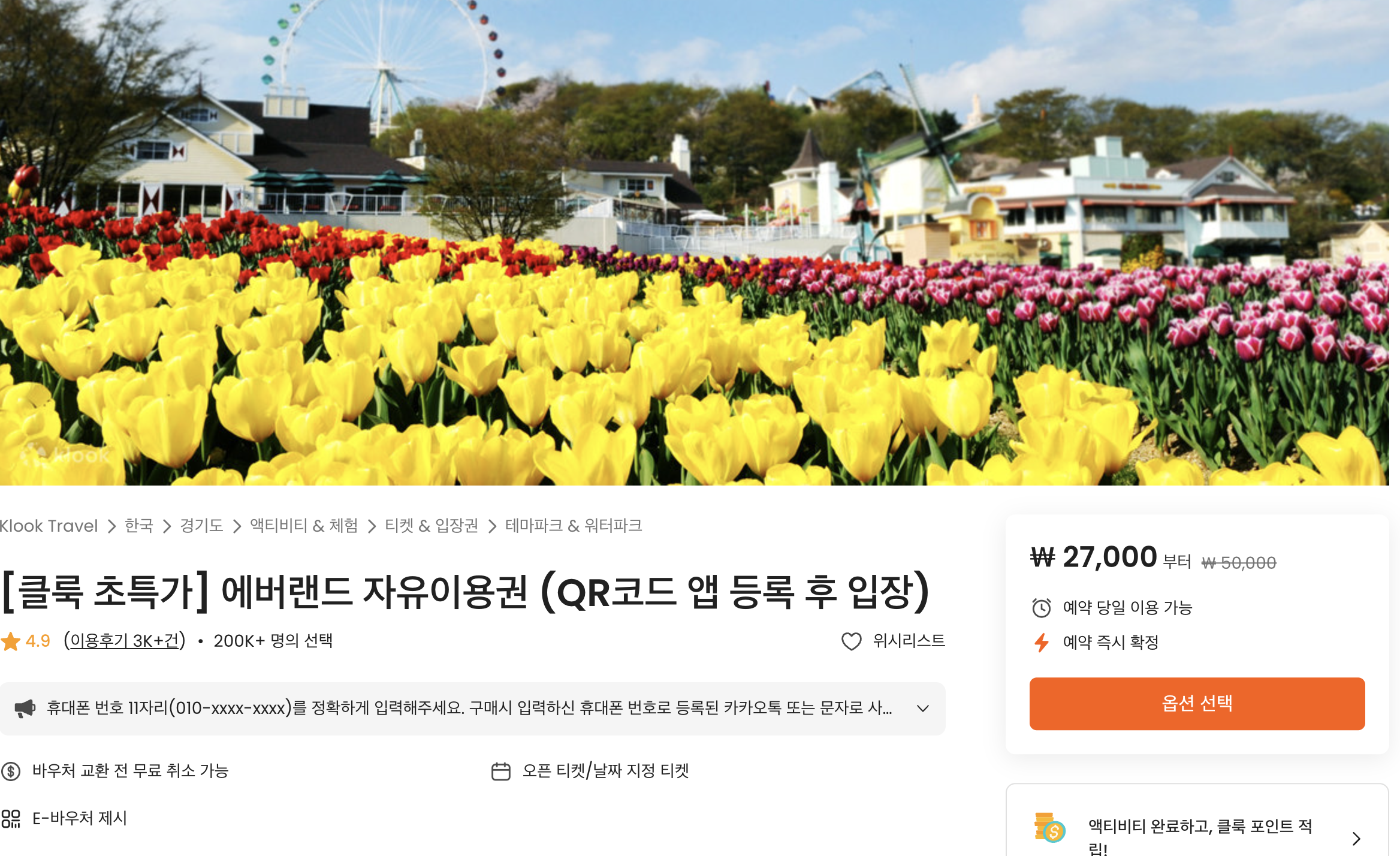 에버랜드는 눈치게임만 잘 하면 다양한 어트렉션을 쾌적하게 이용할 수 있는 믿고 가는 추천 국내여행지이죠. 하루 종일 자유이용권을 27,000원에 이용할 수 있는 건 클룩의 엄청난 할인혜택이 아닐까 싶습니다. 위 이미지를 클릭하여 이동할 수 있습니다.