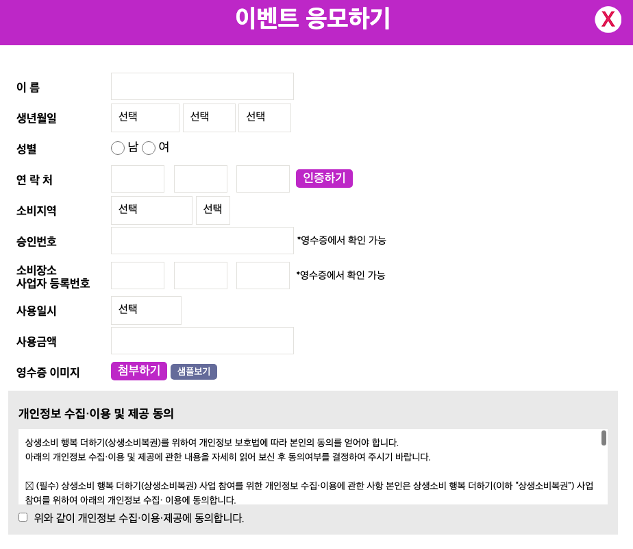 - 입력하신 정보와 영수증 사진이 명확하지 않을 경우 당첨이 취소될 수 있습니다.