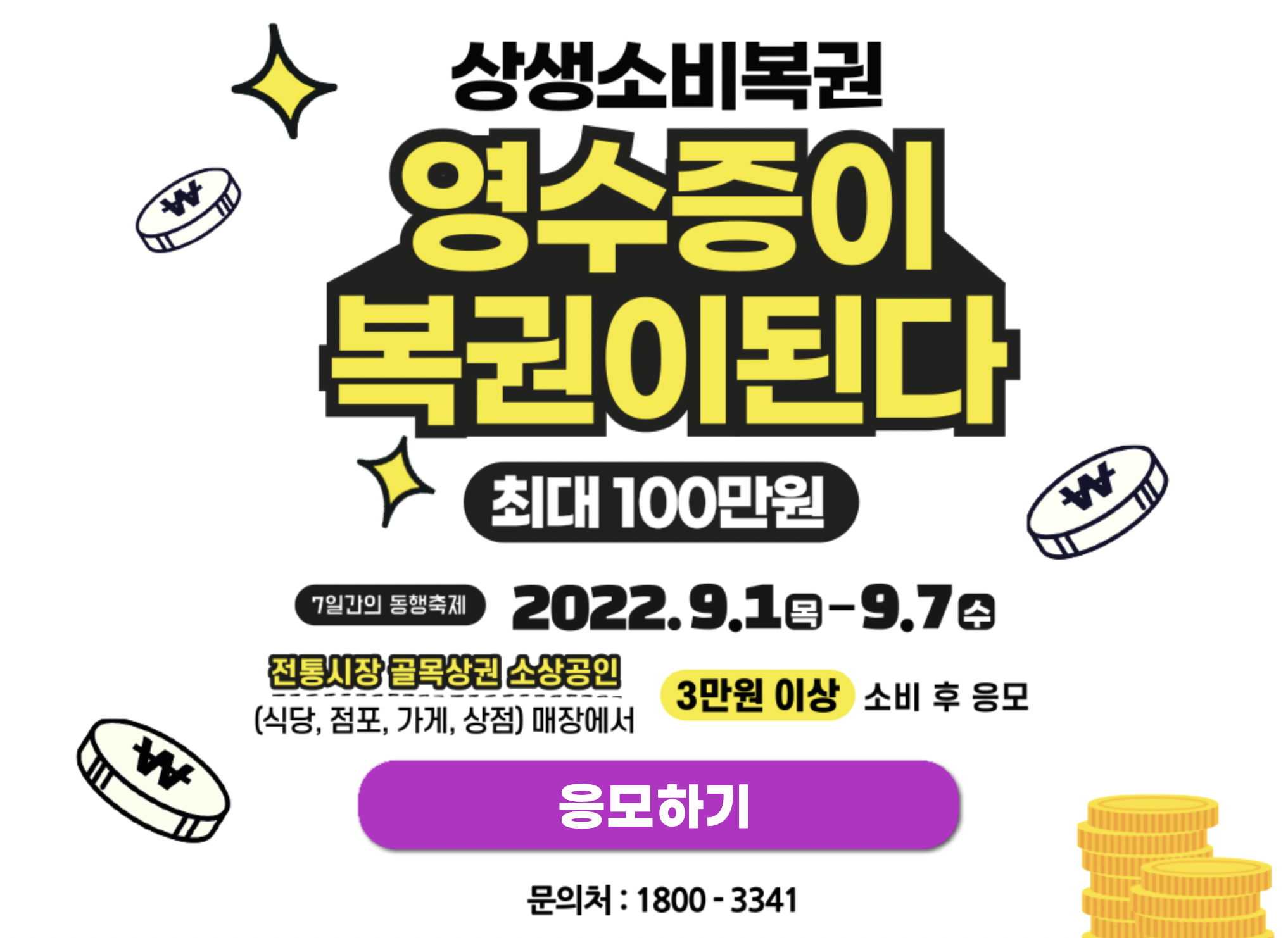 전국민을 상대로 2022년 9월 1일부터 9월 7일까지 3만원 이상 소비한 영수증으로 응모하면 최대 100만원을 받을 수 있는 복권이 되는 상생소비복권 이벤트가 진행중입니다. 저도 영수증으로 응모를 해봤기에 후기를 작성해봅니다.