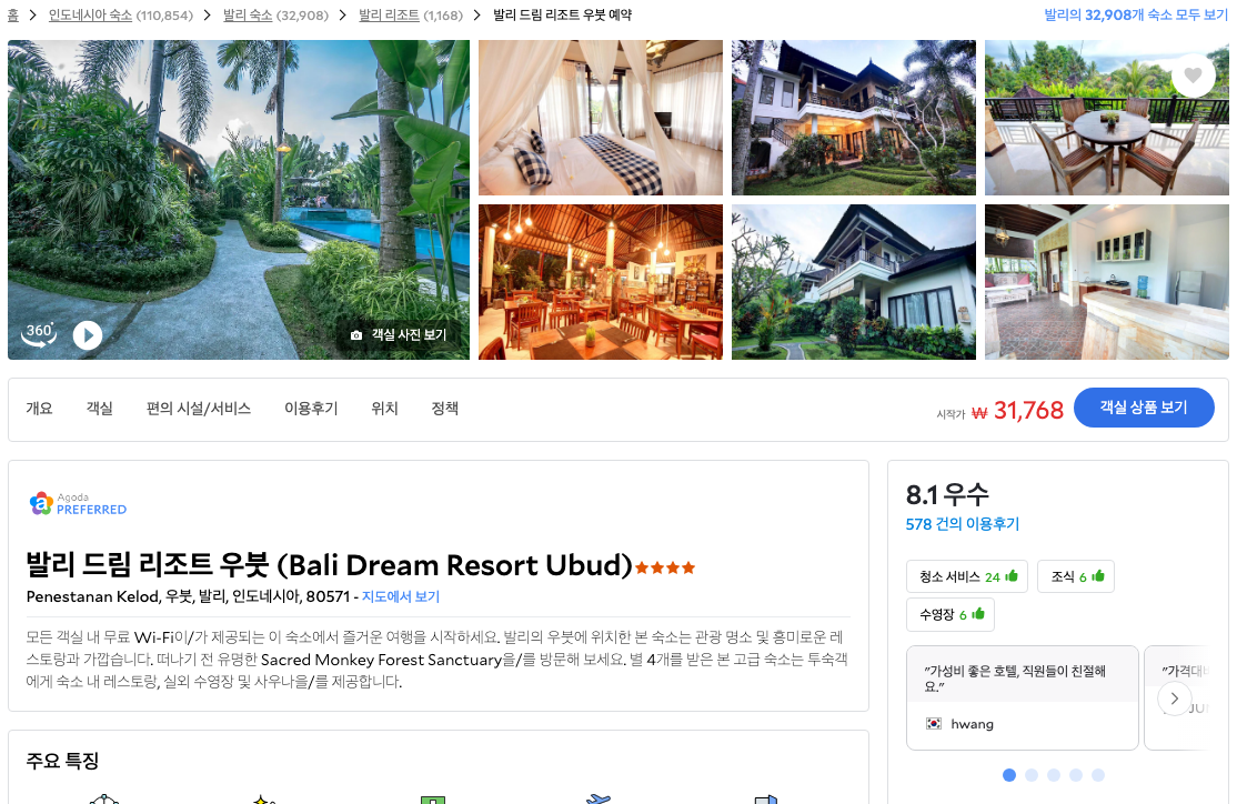 인도네시아 발리 여행을 한달간 하면서 가장 오래 있었던 곳은 길리T 트라왕안이었고, 그 다음은 발리 쿠타 해변, 그리고 마지막 5일은 우붓에서 힐링하기로 했습니다. 우붓 가성비 숙소를 찾던 중, 아고다에서 3만원대의 발리 드림 리조트 우붓(Bali Dream Resort Ubud)을 찾았습니다.