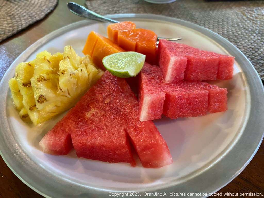 조식은 미국식, 콘티넨탈, 인도네시아식, 발리식, 건강식을 선택할 수 있습니다. 건강식 외에 나오는 과일은 이렇게 잘 나옵니다.