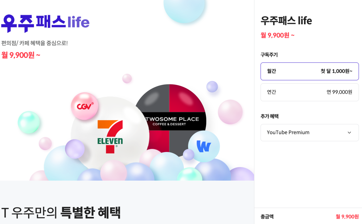 그 해답으로 주목받는 것이 바로 '우주패스 라이프'입니다. 월 9,900원이라는 합리적인 가격에 유튜브 프리미엄 구독은 물론, 세븐일레븐과 투썸플레이스에서의 할인 혜택까지, 다양한 서비스를 이용할 수 있는 상품입니다.