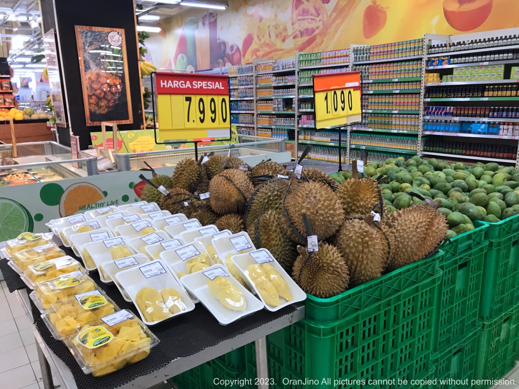 두리안 코너입니다! 팩으로 포장된 것이 7~8만 루피아정도인데, 현지인에겐 조금 부담 되는 가격일 수 있겠다는 생각이 드네요. 두리안이 뭐 자주 쉽게 먹을 수 있는 건 아니라 생각하면 괜찮은 가격인 것 같습니다.