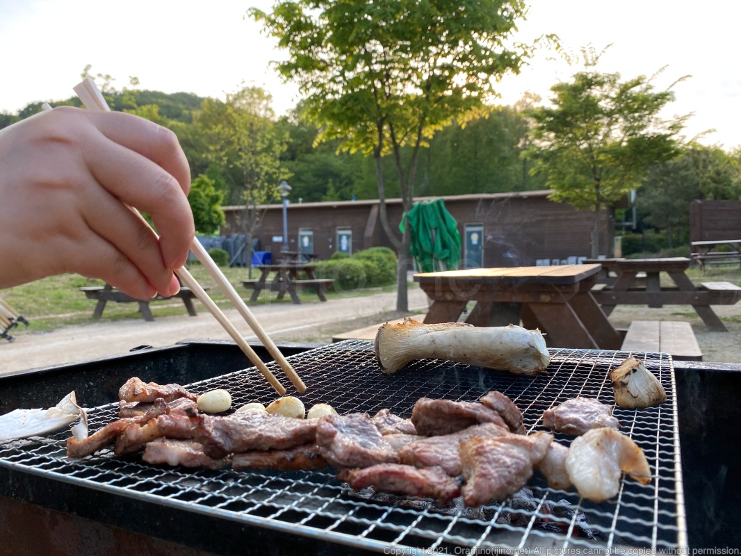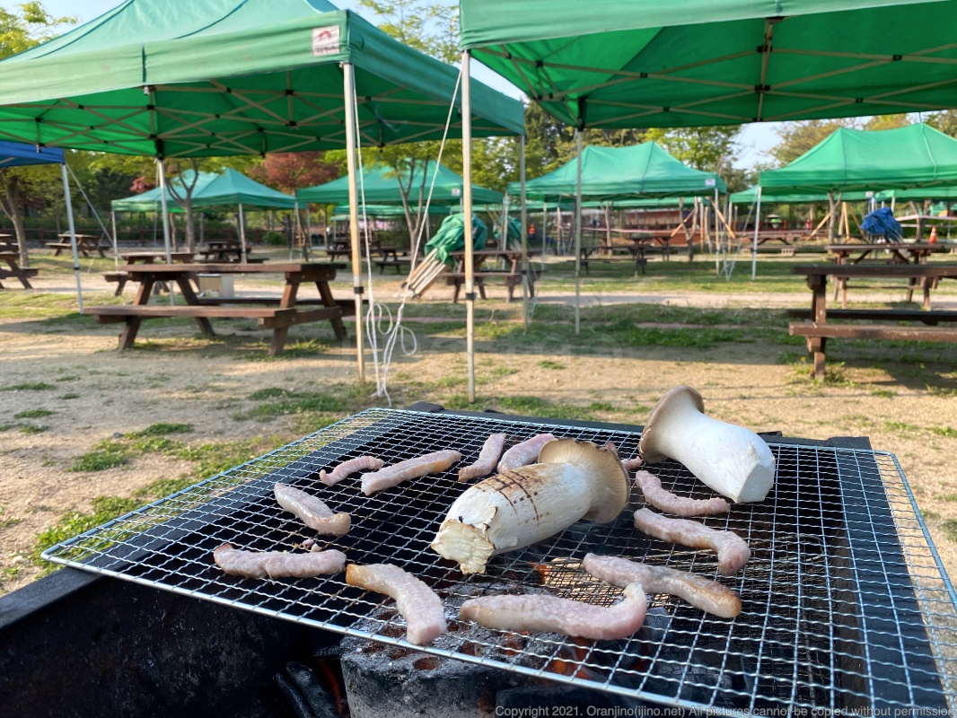 인천대공원 캠핑장 매점에도 삼겹살과 목살 등을 팔고 있었지만 좋아보이진 않아 근처에서 찾아보니 가까운 곳에 마트가 있어서 장을 보고 왔습니다. 팔에 띠가 있어서 재입장이 가능하기에 금방 다녀올 수 있었죠.