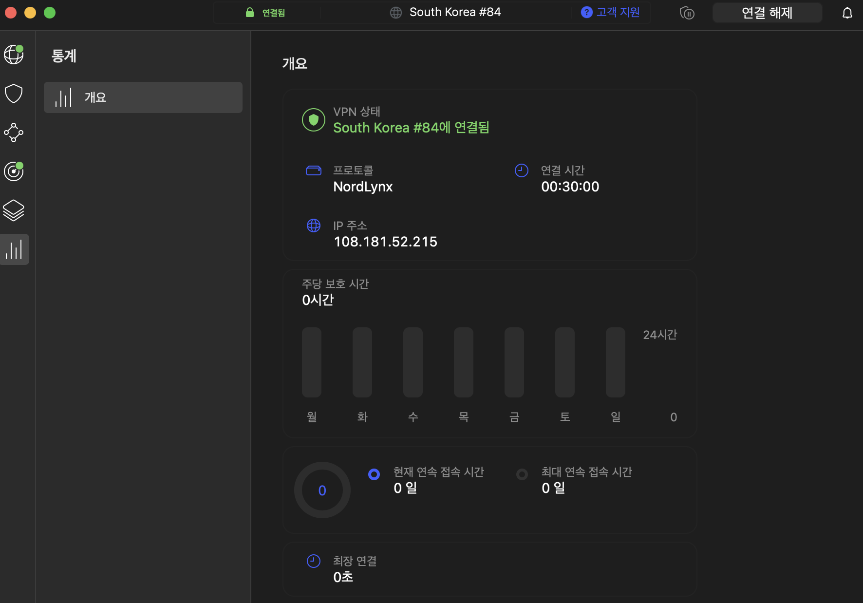 저는 맥북에어, 아이폰, 아이패드 모두 설치를 했는데 아래는 맥북에어에서 한국으로 VPN이 연결된 화면입니다.