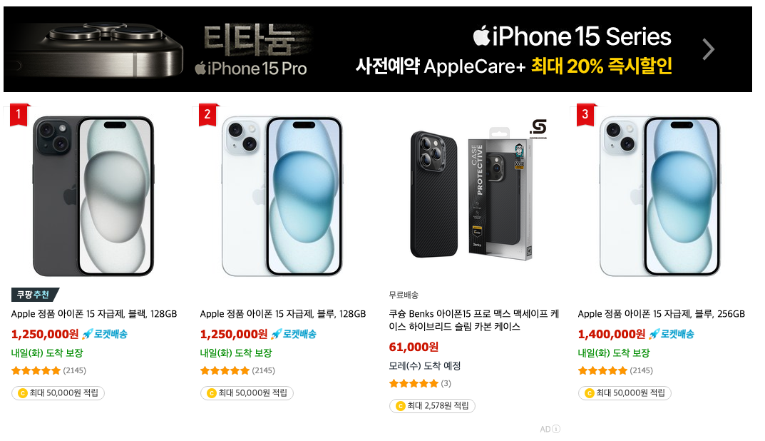공식 리셀러 온라인 쿠팡도 아이폰 15 가격은 125만원 그대로 판매되고 있습니다.