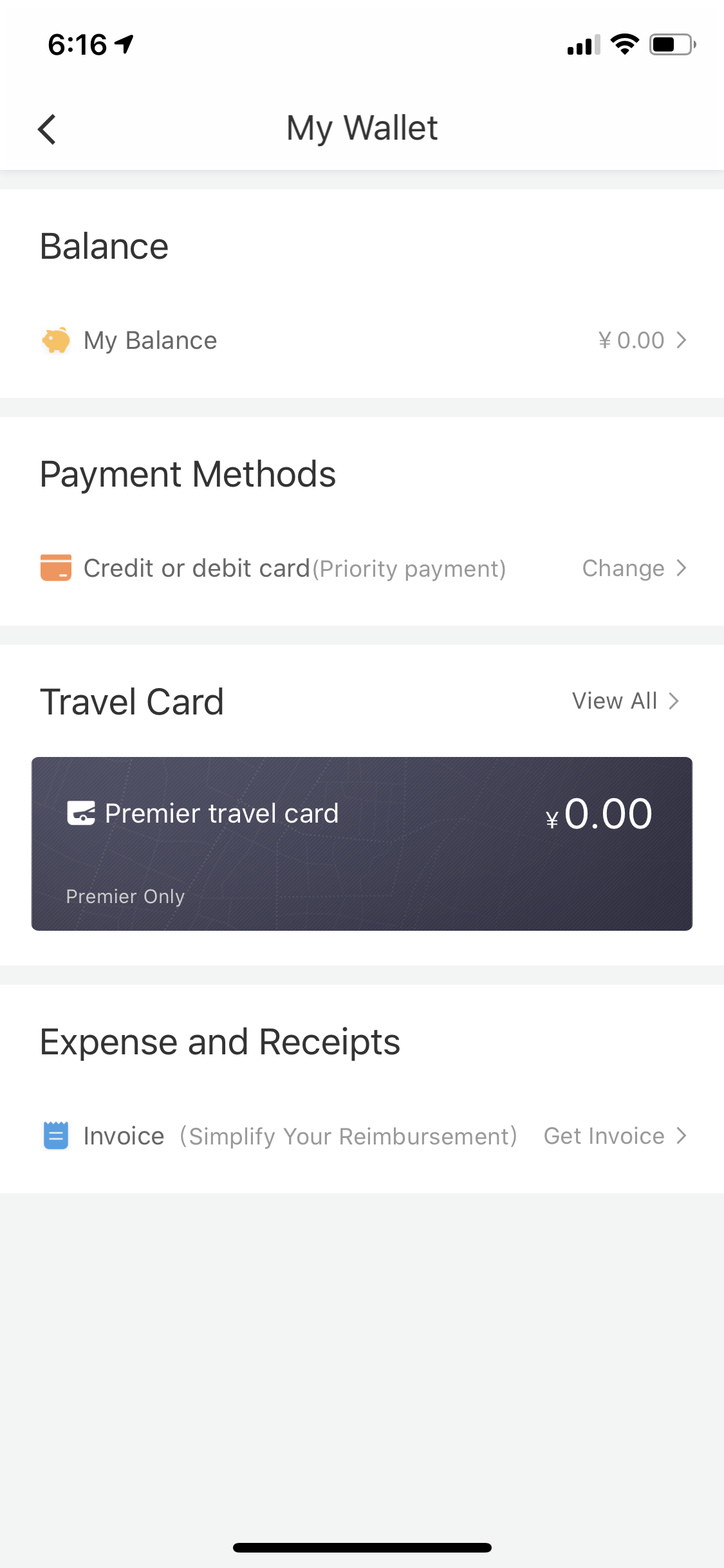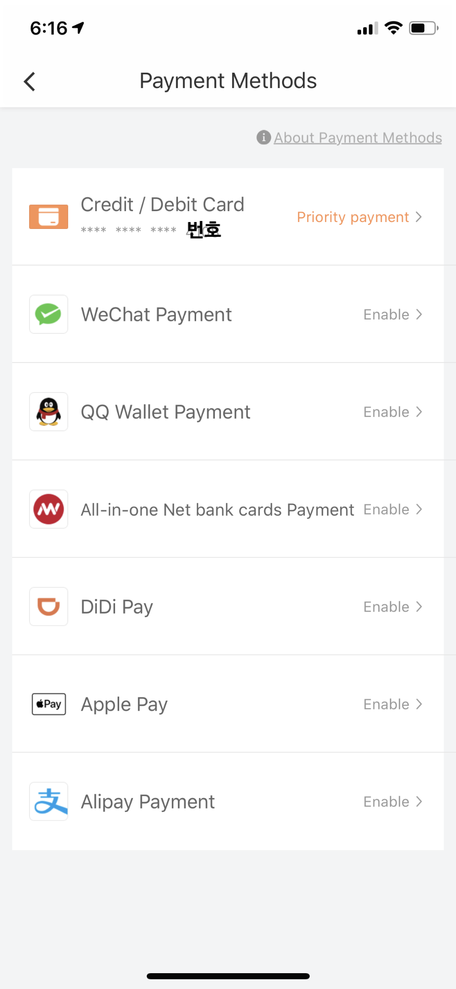 My Wallet 의 Payment Methods 에 Credit / Debit Card 메뉴를 통해 해외 결제 신용카드, 체크카드를 등록할 수 있습니다. 위챗페이, QQ, DiDi Pay, 알리페이, 애플페이 등도 추가가 가능하네요.