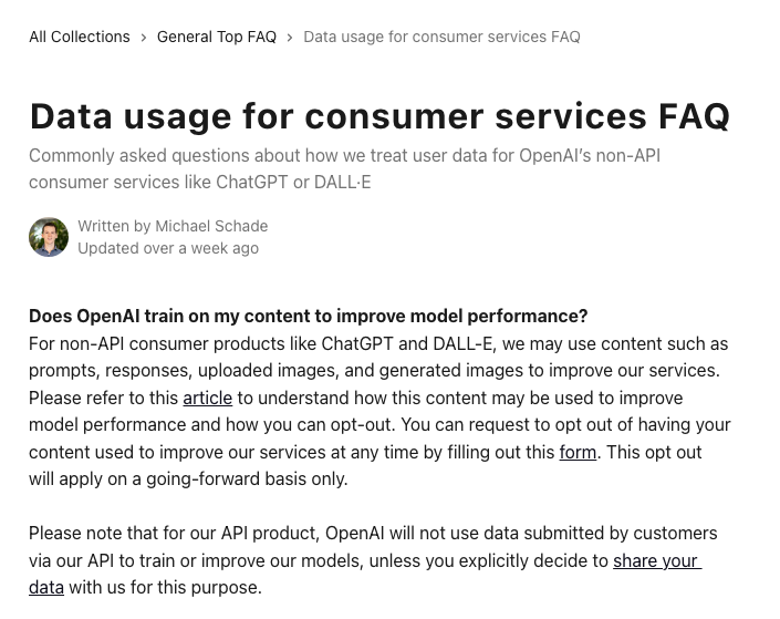 비API 소비자 서비스에서 OpenAI는 서비스 개선을 위해 프롬프트, 응답, 업로드된 이미지 등을 사용할 수 있습니다. 이를 선택 해제하려면 특정 양식을 작성할 수 있습니다. API 제품의 경우, 사용자가 명시적으로 동의하지 않는 한 데이터는 모델 교육에 사용되지 않습니다.