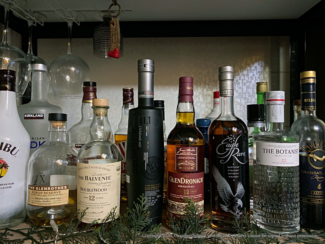 잠시 제 술 진열장을 보여드리죠! 싱글몰트 위스키는 옥토모어, 발베니, 글렌드로낙, 글렌로쓰가 있고 버번위스키는 이글레어, 짐빔, 벨즈, 보드카는 벨루가 등이 자리를 차지하고 있습니다.