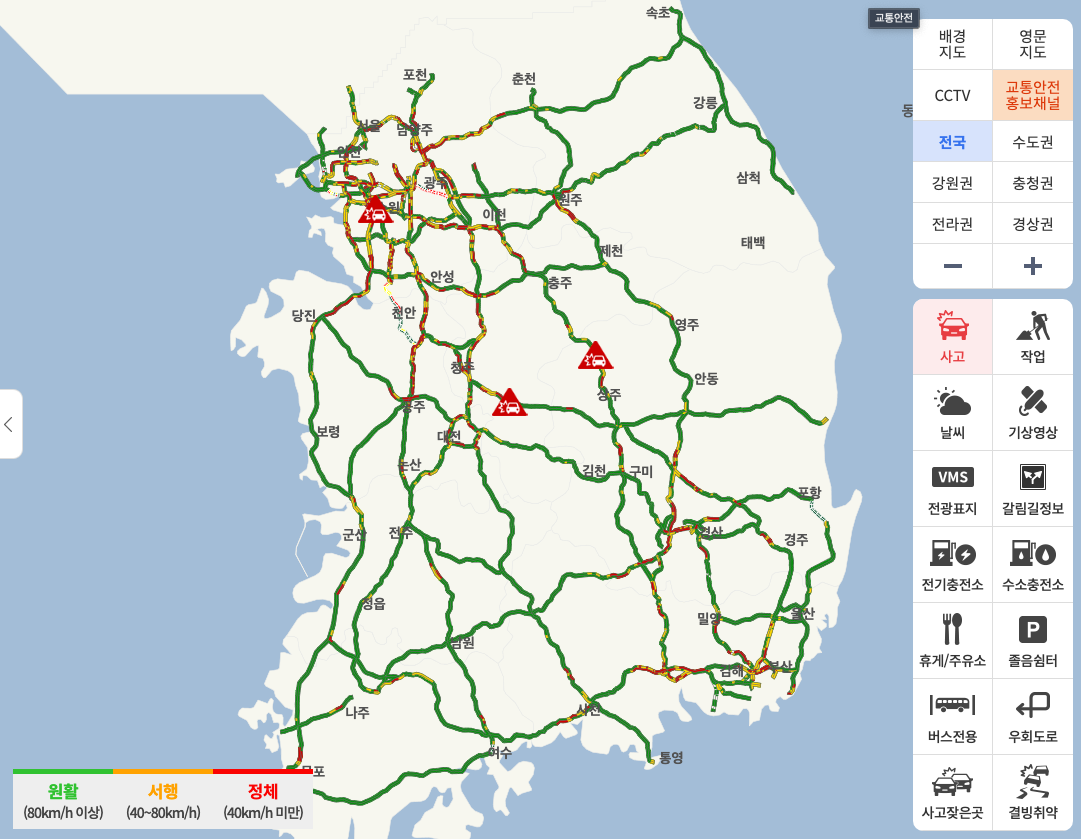 이렇게 실시간 교통 상황도 제공하고 있습니다. 현재 3건의 사고가 처리중에 있는 모습을 볼 수 있습니다. CCTV 확인 등도 운전 중 막히는 길을 피하기 위해 좋은 방법이 될 것입니다.