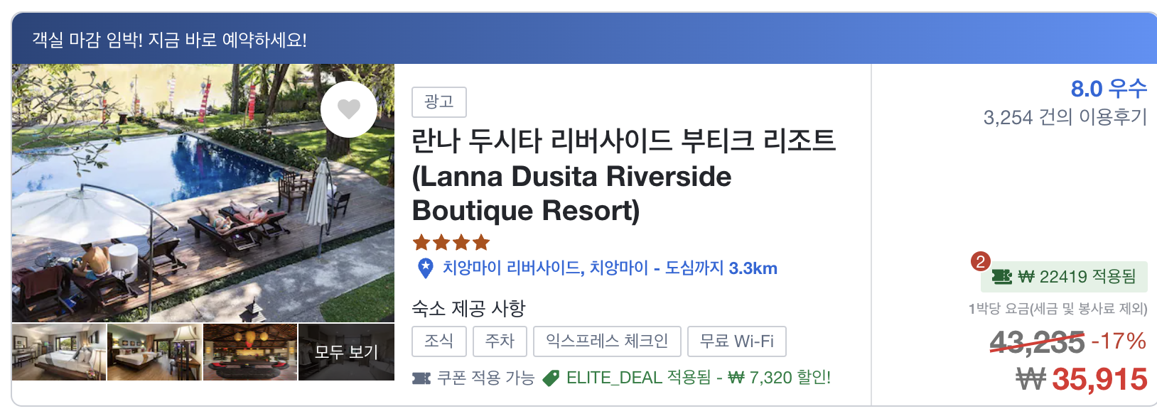 위치가 좀 안좋아서 그렇지 이 란나 두시타 리버사이드 리조트는 꽤 좋은 곳인데, 비수기엔 3만원대라 가성비가 정말 좋은 것 같습니다. 저는 건너편 림타라 호텔에 있었는데 추천할만한 곳은 아닙니다.