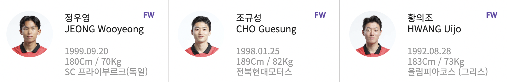 공격, 포워드는 (작은)정우영, 조규성, 황의조 3명이 선발되었습니다. 그동안 선발되었던 명단과 크게 다르지 않습니다.