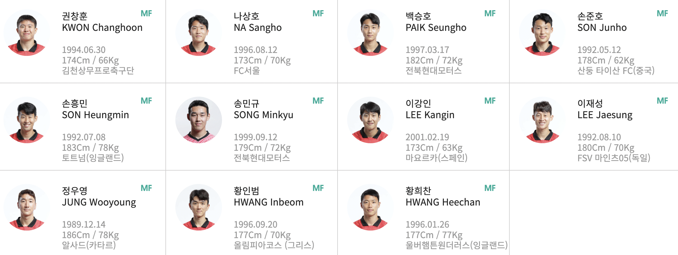 미드필더에는 부상 회복중인 손흥민이 포함된 11명의 선수가 있습니다. 이강인, 황희찬, 황인범, 이재성 등 유럽에서 활약중인 선수들이 눈에 띕니다.