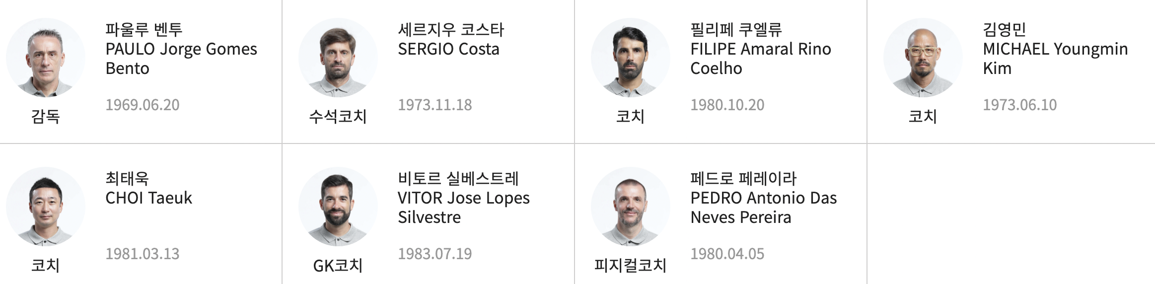 마지막으로 코치진은 파울루 벤투(PAULO Jorge Gomes Bento)감독 등이 있고, 우리나라 코치는 김영민, 최태욱이 있습니다.