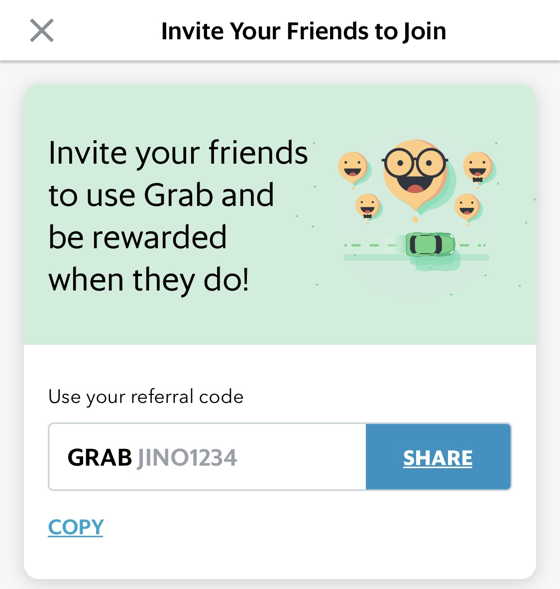 그랩 가입 시 리퍼럴 코드를 넣으면 할인 적용이 되는데, 이 때 제 코드 GRAB JINO1234 를 적으시는 것도 좋을 것 같습니다.
