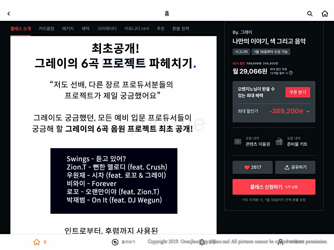 그레이 클래스 소개 중 가장 마음에 들었던 것은 바로 그레이의 프로젝트 6곡을 공개한다는 점이었습니다. 뮤지션이 음원 프로젝트를 공개하는 일은 정말 드문 일이거든요. 이 부분이 정말 기대가 되어 수강을 결정하지 않을 수 없었습니다.