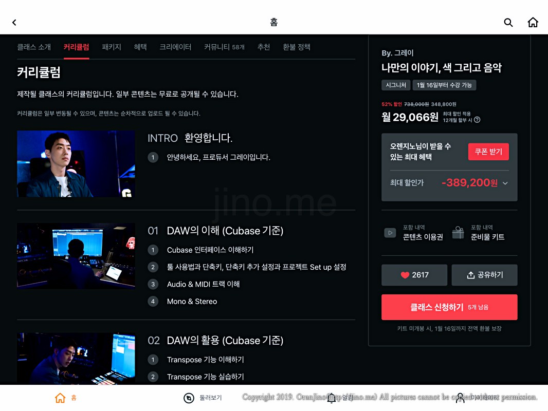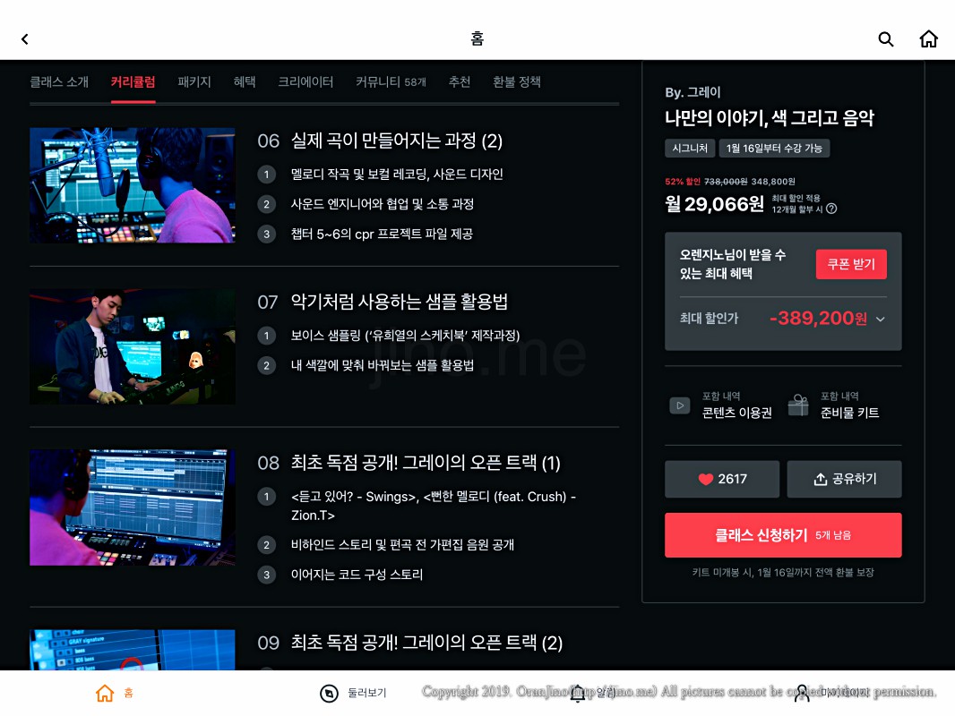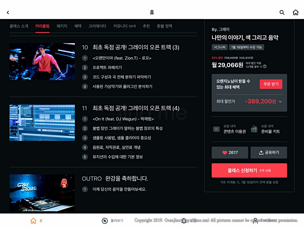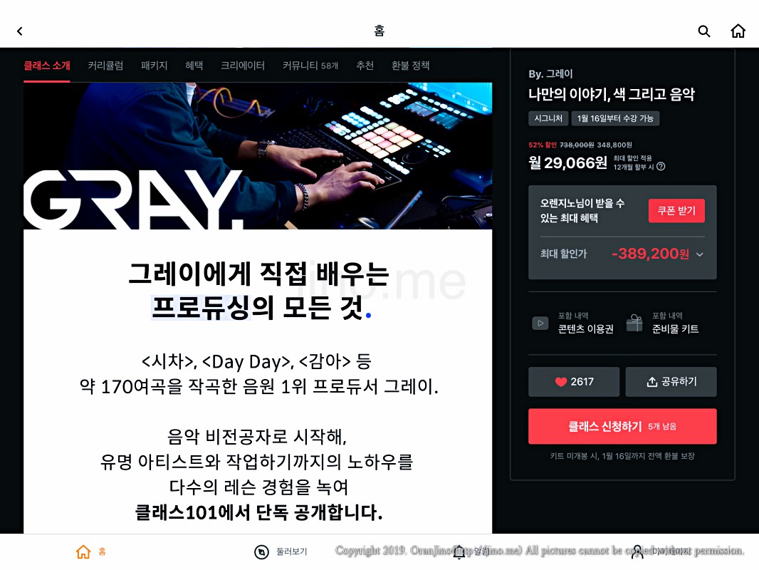 그레이의 프로듀싱 클래스입니다. 사실 전 이미 직접 프로듀싱 하여 음원을 출시한 상태이긴 한데, 배울 것이 아직 더 많다고 생각하고 있어요. 클래스101 그레이클래스는 그럴만한 매력이 있더라고요. 52주 수강권을 이미 결제하고 강의 오픈을 기다리고 있습니다.