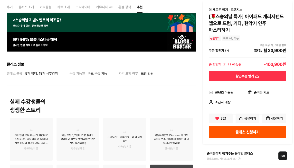 클래스101의 블록버스터 할인 이벤트가 시작되었습니다. 취미 강의 등 온라인 강좌에선 우리나라 최고 플랫폼인 CLASS101의 할인은 늘 무언가를 배울 기회가 되죠.