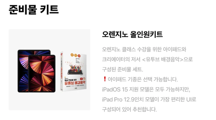 준비물 키트는 오렌지노 올인원 키트로도 구매가 가능하네요. 이번 기회에 아이패드도 함께 구매하시는 것도 좋을듯합니다.