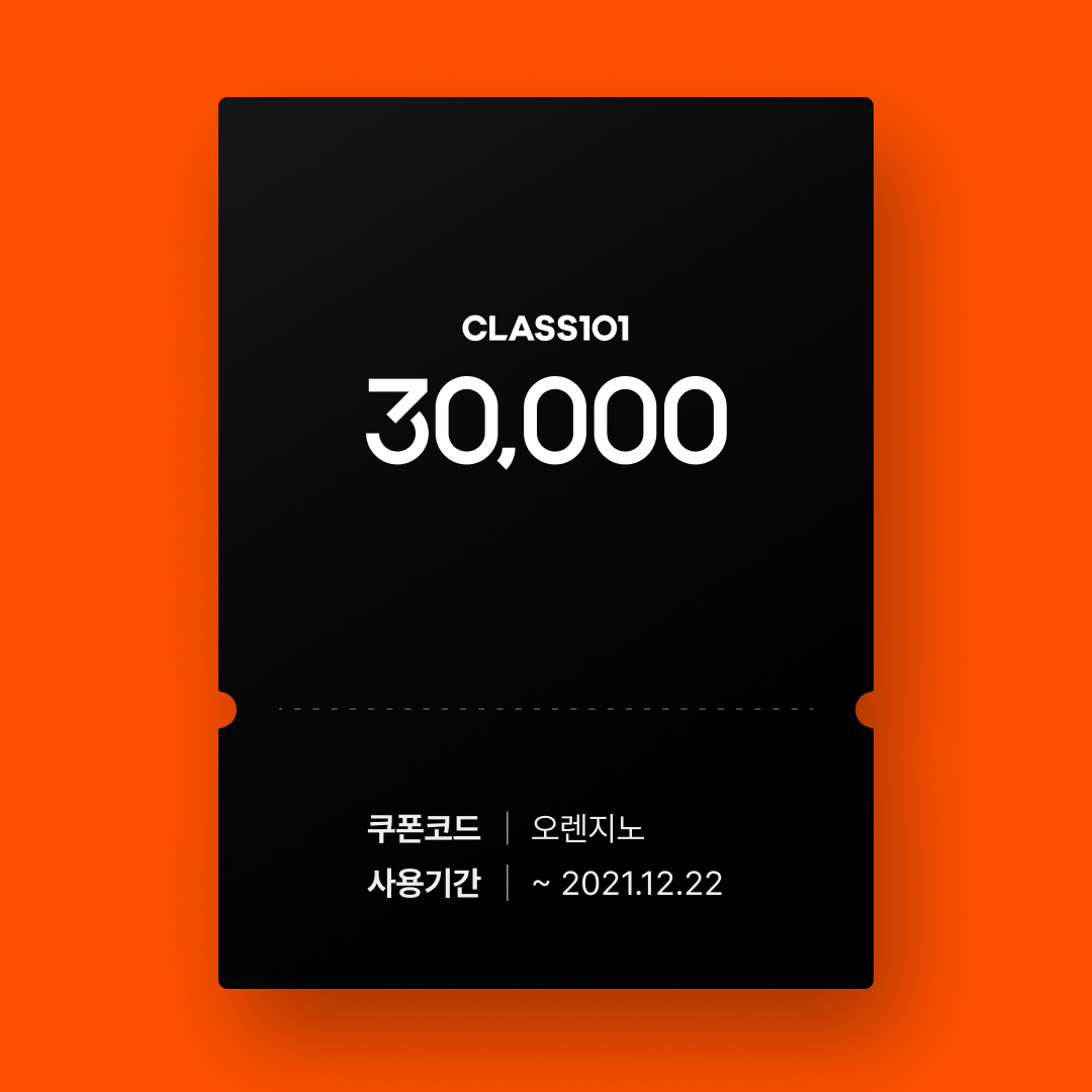 클래스101에서 제공해주신 오렌지노 쿠폰이 있습니다. 제 강의의 오픈일인 12월 22일까지 사용하실 수 있는 class101 3만원 할인 쿠폰 코드는 바로 '오렌지노'입니다.