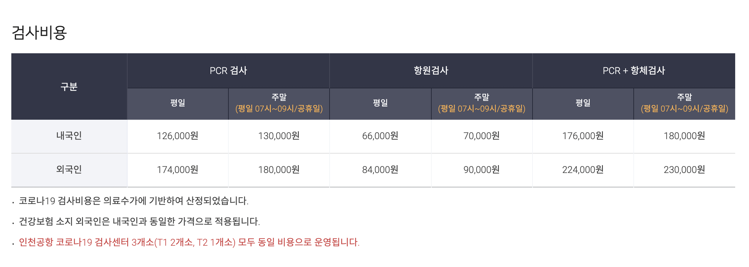 미리 사전 예약을 해야하고, RT-PCR 코로나 검사 비용은 아래와 같습니다.