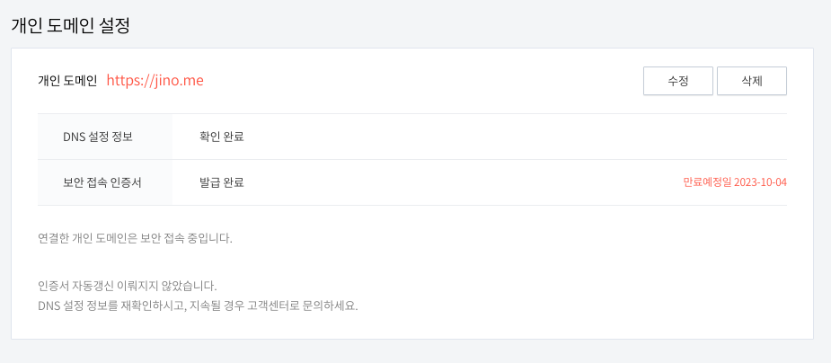 2023년 10월 8일 개인 도메인 보안 접속 인증서가 정상적으로 작동하기 시작했습니다.
