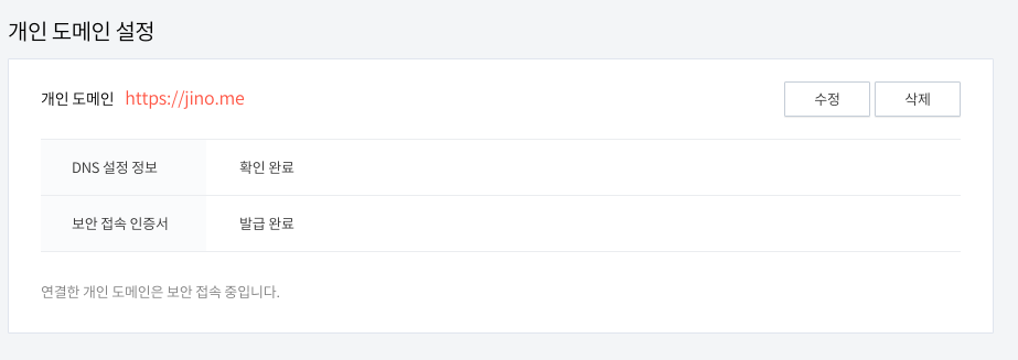 2023년 10월 8일 개인 도메인 보안 접속 인증서가 정상적으로 작동하기 시작했습니다.
