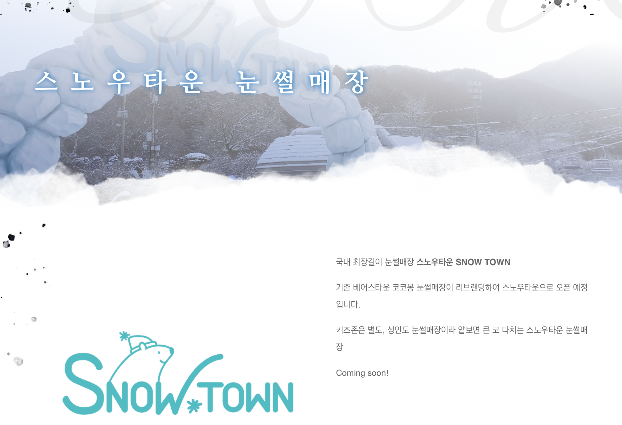 SNOW 스노우타운 눈썰매장 국내 최장길이 눈썰매장 스노우타운 SNOW TOWN 기존 베어스타운 코코몽 눈썰매장이 리브랜딩하여 스노우타운으로 오픈 예정입니다. 키즈존은 별도, 성인도 눈썰매장이라
