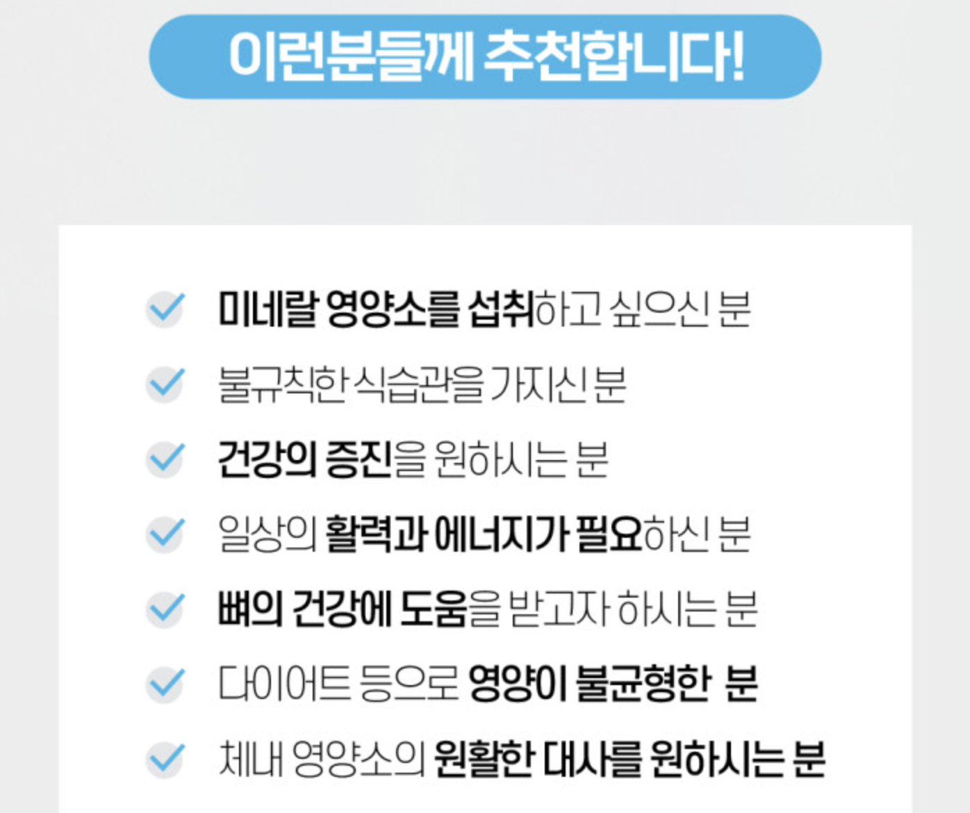 미네랄은 피로회복을 위해 제일 중요한 성분으로 에너지와 면역, 항산화 관리를 위해 중요합니다. 종합 비타민은 많이들 드시지만 종합미네랄을 챙기는 분들은 많지 않죠.