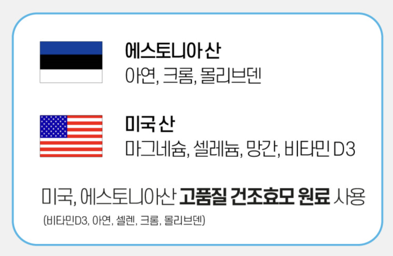 미네랄 원료 각각의 원산지도 꼼꼼하게 체크하고 있는데요. 미국, 에스토니아처럼 고품질 건조효모 원료를 생산하는 국가의 미네랄 원료인지 꼭 확인해보는 것을 추천해요.