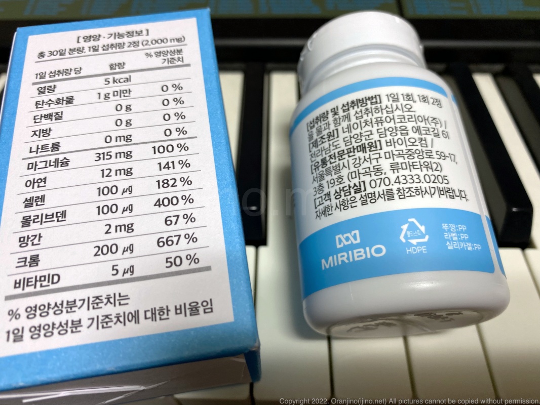 라벨을 보면 첨가물들을 확인할 수 있는데요, 일반적으로 HPMC, 스테아린산마그네슘, 이산화티타늄 등은 타블렛의 모양을 만들거나 제품의 유통기한을 늘리는 용도로 첨가되는 성분인데, 이러한 합성 첨가물은 섭취 시 체내에서 잘 배출되기 힘들어 성분표를 꼼꼼히 살피는 것이 중요합니다.