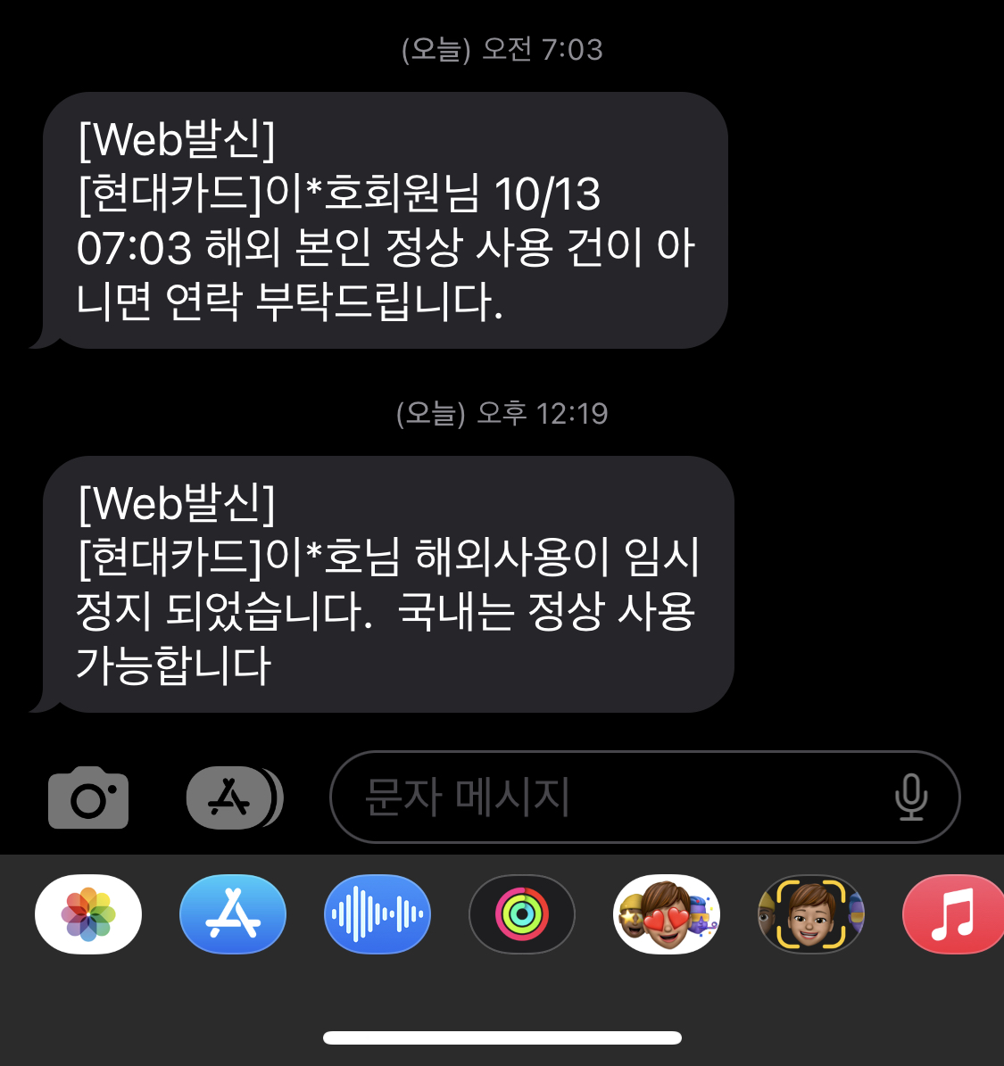 스미싱 의심도 했으나 일단 아이폰을 쓰고 있고 이 번호는 늘 문자를 받던 현대카드 번호가 맞기에 현대카드 앱으로 해외결제된 건이 뭔지 확인부터 해야했습니다.