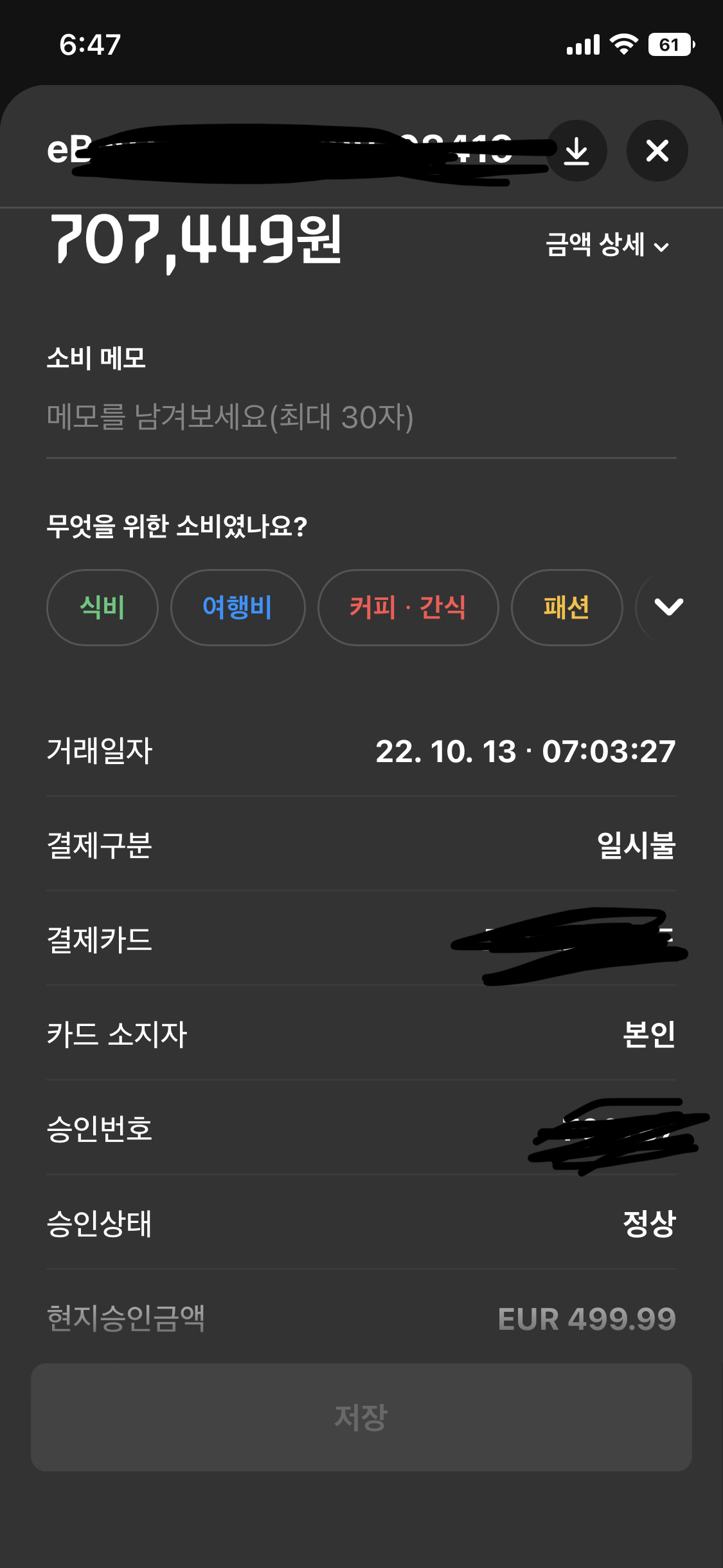 현대카드 앱의 최근 결제내역을 보니 제가 자고 있던 시각에 이베이에서 499.99유로가 결제되어 있었습니다. 우리나라 돈으로 환산했을 때 약 70만원이네요.