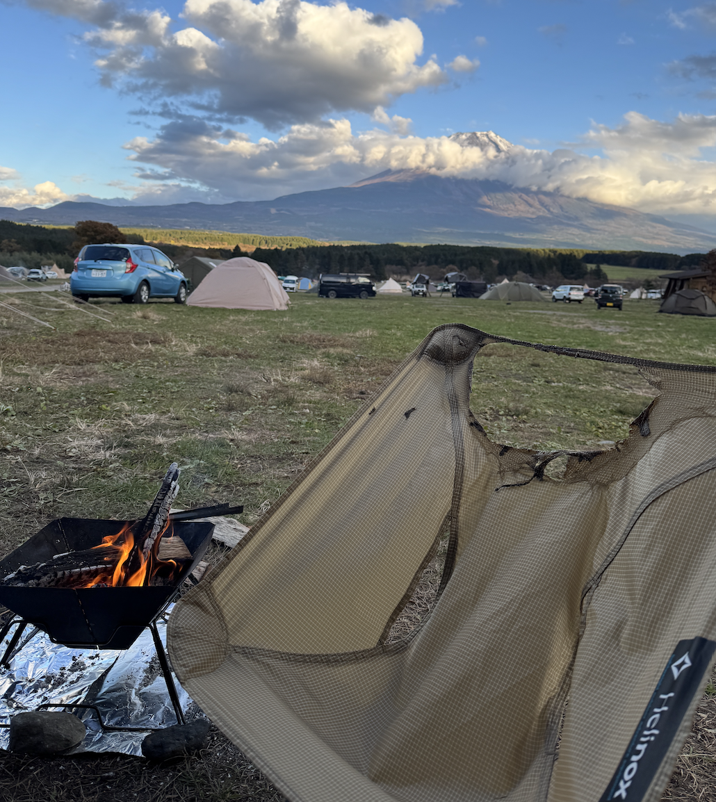 후지산이 정면으로 보이는 잔디밭, 황금빛으로 변하던 구름, 적당히 차가운 바람. 캠핑의 3요소가 완벽하게 맞아떨어진 저녁이었습니다. 저는 평소처럼 화롯대에 불을 피우고, 믿고 앉는 헬리녹스 체어에 기대어 힐링하고 있었습니다.