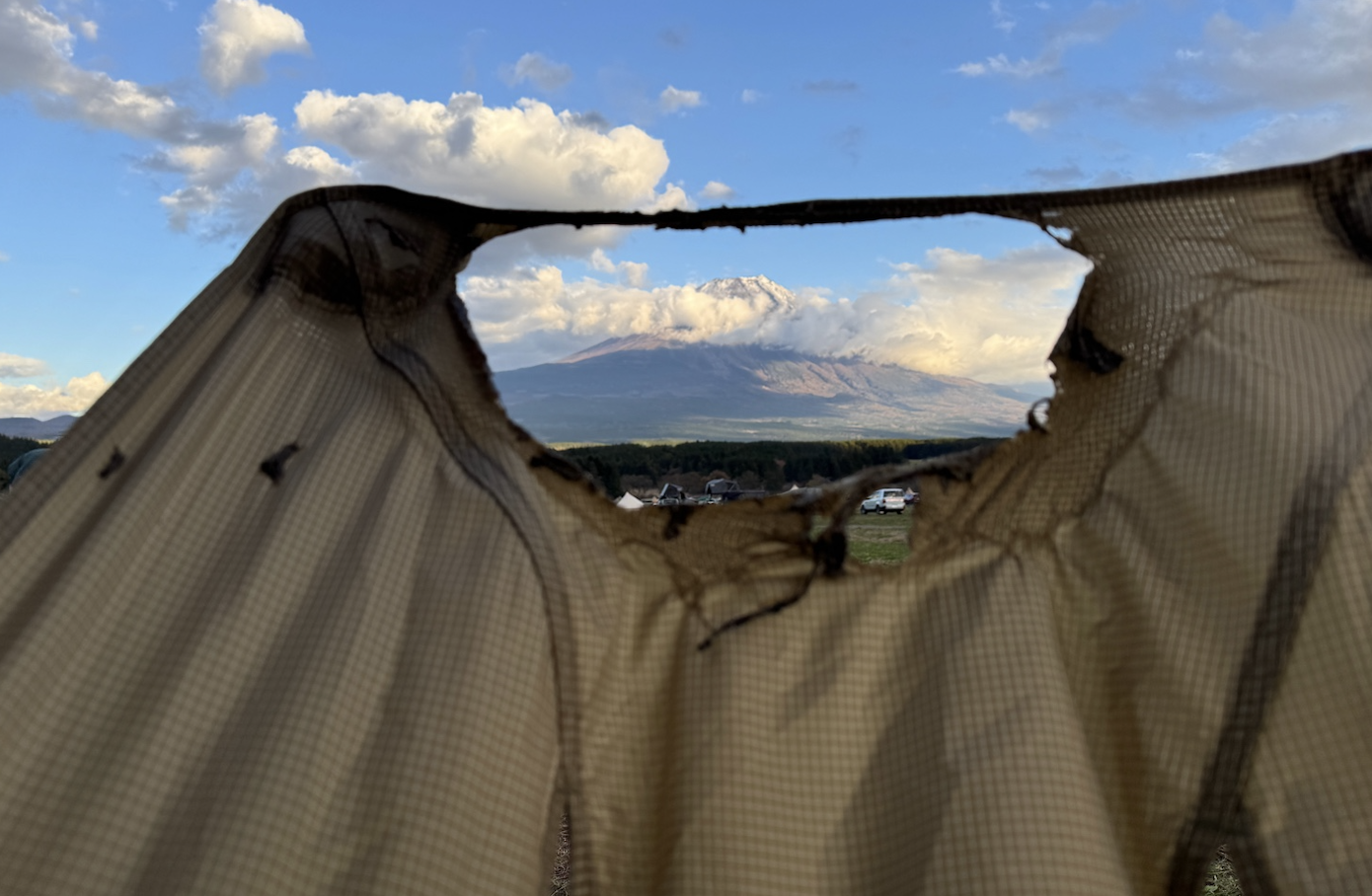 사진으로 보면 더 가슴이 쓰립니다. 찢긴 메쉬 너머로 후지산이 너무나 또렷하게 서 있습니다. 풍경이 프레임을 빼앗아 간, 아이러니한 명장면이 탄생했습니다.